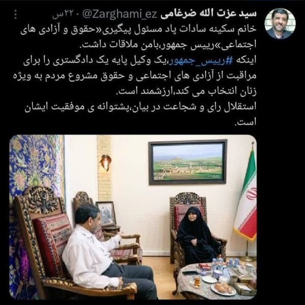 داشتن یک وکیل پایه یک دادگستری زن برای رییس جمهور یک مزیت استایمان رنجکش۱۴۰۲-۱۱-۲۴وزیر میراث فرهنگی درباره دیدار خود با مسول پیگیری حقوق و آزادی های اجتماعی رییس جمهور توییتی را منتشر کرد ... ادامه مطلب