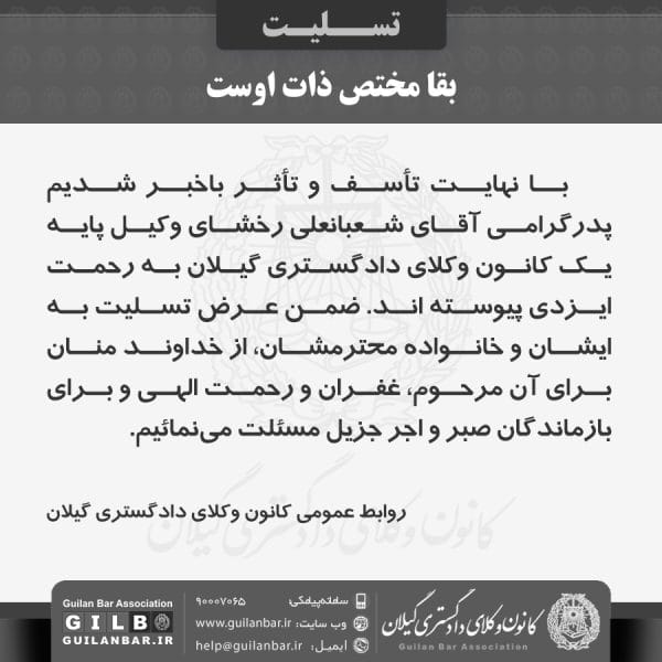 تسلیتایمان رنجکش۱۴۰۳-۰۲-۱۱با نهایت تأسف و تأثر باخبر شدیم پدرگرامی آقای شعبانعلی رخشای وکیل پایه یک کانون وکلای دادگستری گیلان به رحمت ... ادامه مطلب