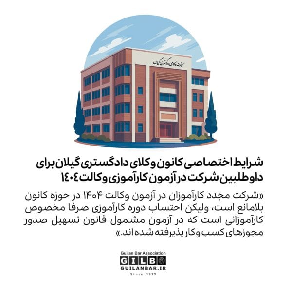 شرایط اختصاصی کانون وکلای دادگستری گیلان برای داوطلبین شرکت در آزمون کارآموزی وکالت 1404ایمان رنجکش۱۴۰۴-۰۶-۲۴«شرکت مجدد کارآموزان در آزمون وکالت ۱۴۰۴ در حوزه کانون بلامانع است، ولیکن احتساب دوره کارآموزی صرفا مخصوص کارآموزانی است ... ادامه مطلب