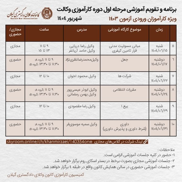 برنامه و تقویم آموزشی مرحله اول دوره کارآموزی وکالت (شهریور 1404) / ویژه کارآموزان ورودی آزمون 1403ایمان رنجکش۱۴۰۴-۰۶-۱۳کمیسیون کارآموزی کانون وکلای دادگستری گیلان برنامه و تقویم آموزشی حضوری و مجازی مرحله اول دوره کارآموزی وکالت (شهریور ۱۴۰۴) ... ادامه مطلب