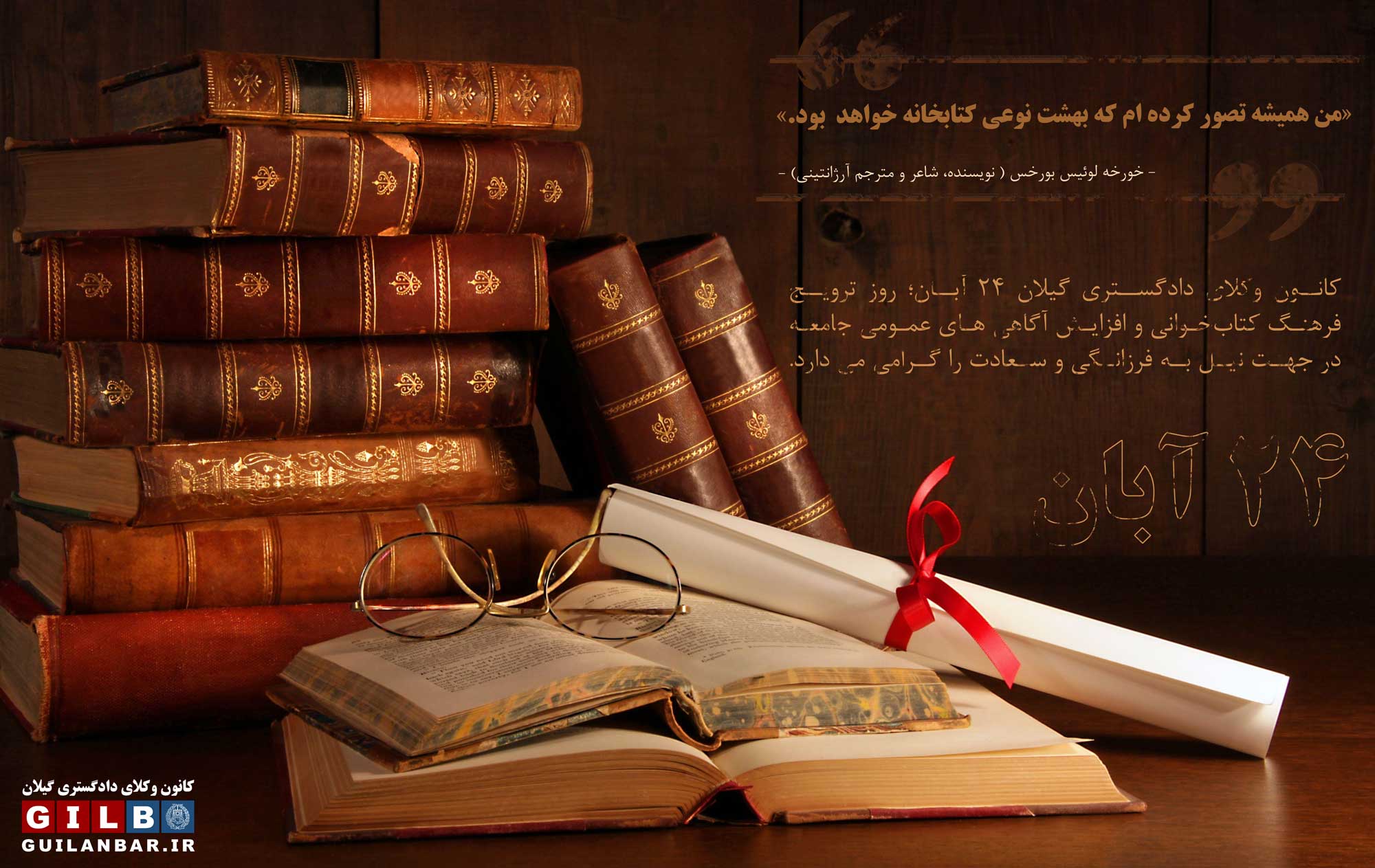 کانون وکلای دادگستری گیلان ۲۴ آبان؛ روز ترویج فرهنگ کتابخوانی و افزایش آگاهی های عمومی جامعه در جهت نیل به فرزانگی و سعادت را گرامی می دارد.