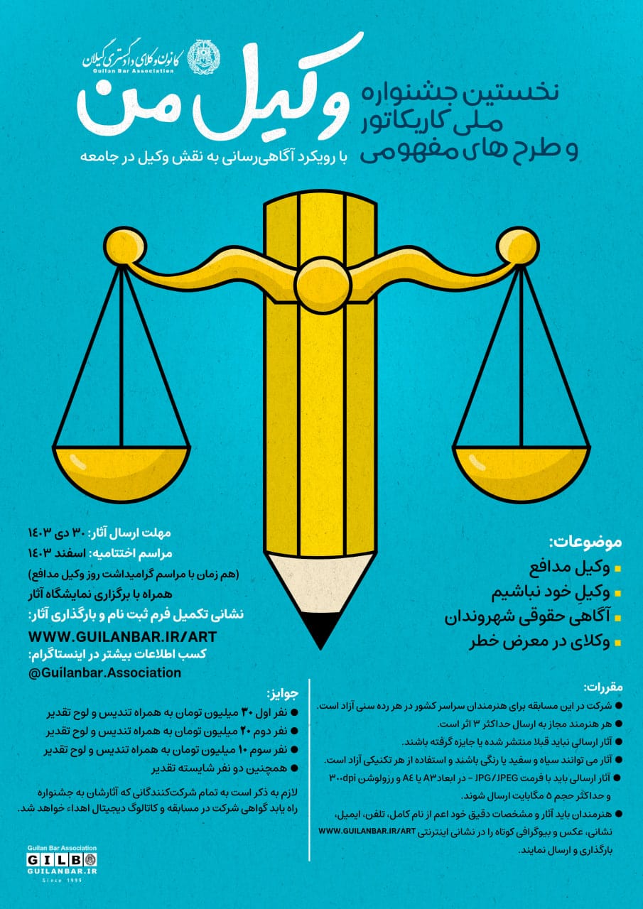روابط عمومی کانون وکلای دادگستری گیلان در نظر دارد نخستین جشنواره ملی کاریکاتور و طرحهای مفهومی «وکیل من» را با رویکرد آگاهیرسانی به نقش وکیل در جامعه برگزار نماید.