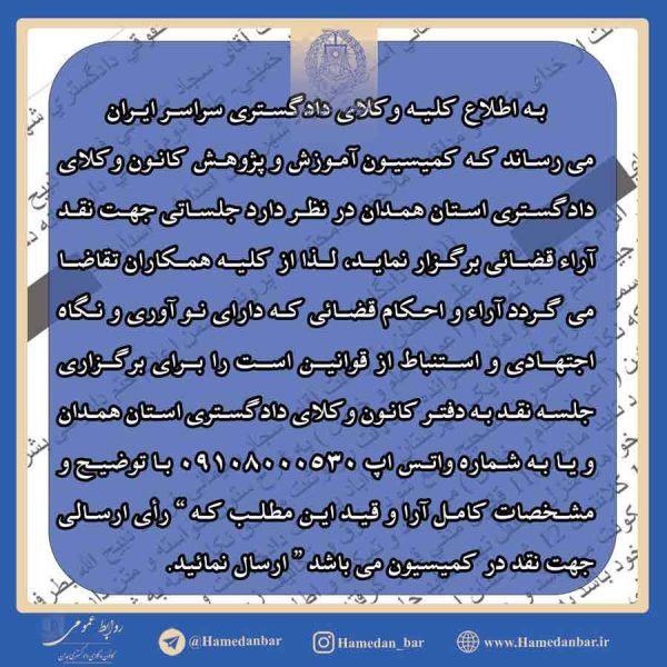 فراخوان نقد آراء قضائی متضمن نظریات حقوقیایمان رنجکش۱۴۰۱-۰۲-۰۴🔶فراخوان نقد آراء قضائی متضمن نظریات حقوقی 🔸به اطلاع می رساند کمیسیون پژوهش های حقوقی کانون وکلای دادگستری استان همدان ... ادامه مطلب