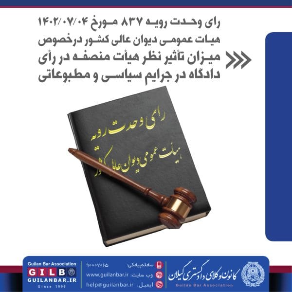 انتشار رای وحدت رویه شماره ۸۳۷ هیات عمومی دیوان عالی کشور درخصوص میزان تأثیر نظر هیأت منصفه در رأی دادگاه در جرایم سیاسی و مطبوعاتیایمان رنجکش۱۴۰۲-۰۷-۲۶مطابق اصل یکصد و شصت و هشتم قانون اساسی جمهوری اسلامی ایران، رسیدگی به جرائم سیاسی و مطبوعاتی با حضور ... ادامه مطلب