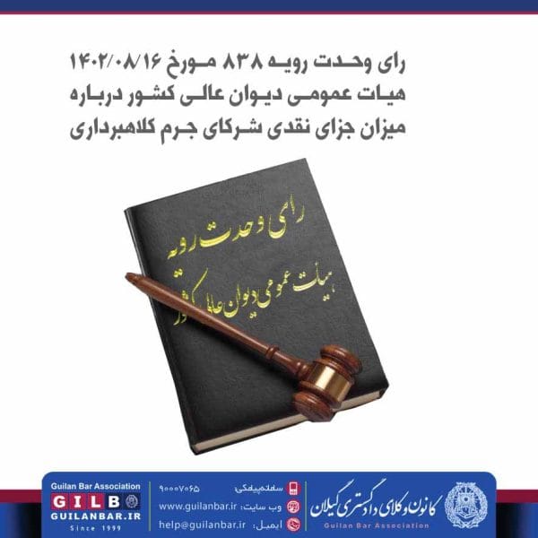 رأی وحدت رویه شماره ۸۳۸ هیأت عمومی دیوان عالی کشور درباره میزان جزای نقدی شرکای جرم کلاهبرداریایمان رنجکش۱۴۰۲-۰۹-۰۷رای وحدت رویه ۸۳۸ هیات عمومی دیوان عالی کشور درباره میزان جزای نقدی شرکای جرم کلاهبرداری مورخ ۱۴۰۲/۰۸/۱۶در روزنامه رسمی ... ادامه مطلب
