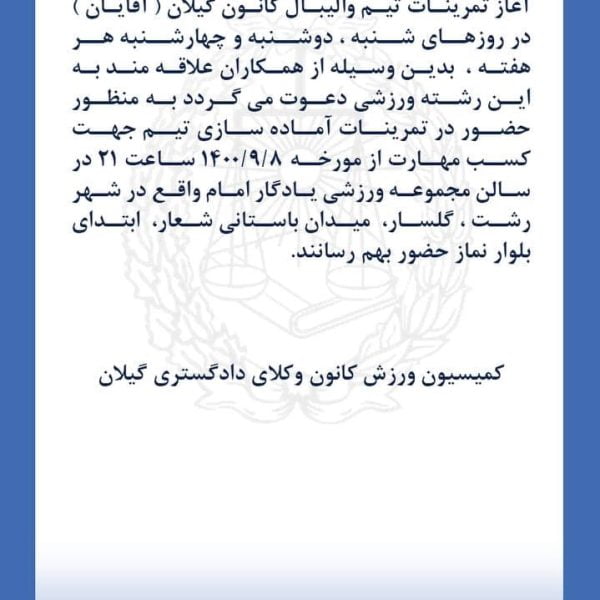 آگهی ورزشیباران نوروزی۱۴۰۰-۰۹-۰۷نظر به در پیش بودن برگزاری پنجمین المپیاد ورزشی کانونهای وکلای دادگستری ایران و آغاز تمرینات تیم والیبال کانون گیلان ... ادامه مطلب
