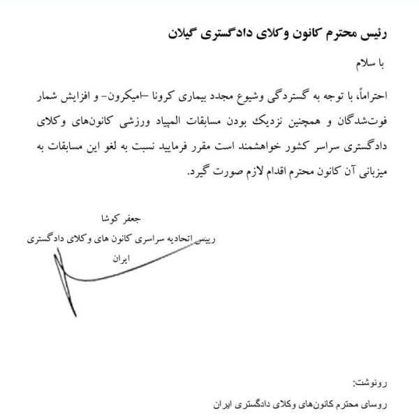 المپیاد ورزشی کانون های وکلای دادگستری لغو شدباران نوروزی۱۴۰۰-۱۱-۱۵🔹 به دلیل گستردگی و شیوع مجدد ویروس کرونا، مسابقات المپیاد ورزشی کانونهای وکلای دادگستری کشور به میزبانی کانون وکلای ... ادامه مطلب