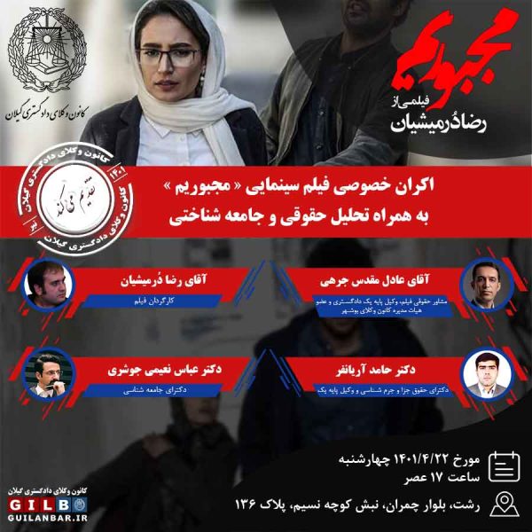 کانون وکلای دادگستری گیلان برگزار می کندایمان رنجکش۱۴۰۱-۰۴-۱۹اکران خصوصی فیلم سینمایی «مجبوریم » به همراه تحلیل حقوقی و جامعه شناختی با حضور کارگردان فیلم آقای رضا دُرمیشیان ... ادامه مطلب
