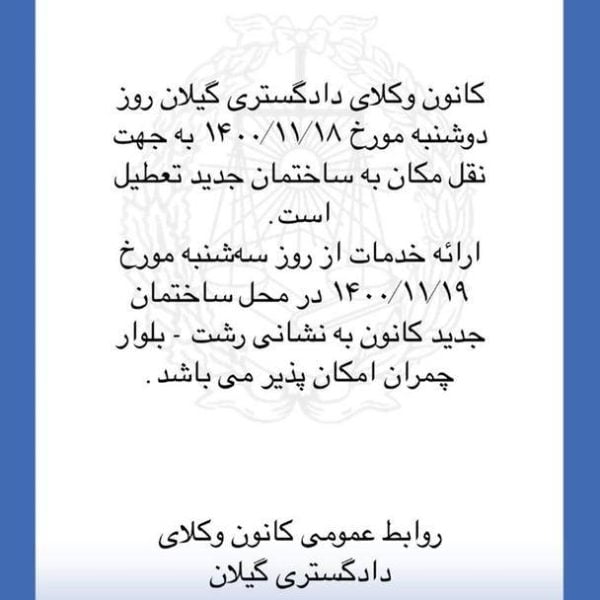 به اطلاع همکاران گرانقدر و مراجعهکنندگان محترم می رساند:باران نوروزی۱۴۰۰-۱۱-۱۷کانون وکلای دادگستری گیلان روز دوشنبه مورخ ۱۴۰۰/۱۱/۱۸ به جهت نقل مکان به ساختمان جدید تعطیل است. ارائه خدمات از ... ادامه مطلب