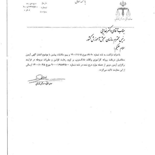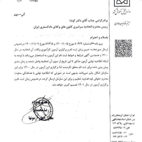 سازمان سنجش بار دیگر از انتشار آگهی آزمون وکالت خودداری کردباران نوروزی۱۴۰۰-۱۱-۰۹🔴باوجود مطالبهی جدی داوطلبان آزمون کارآموزی وکالت ۱۴۰۰ مبنی بر تعیین تکلیفِ هرچه سریعتر این آزمون، تصمیم هیات عمومی اتحادیهی ... ادامه مطلب
